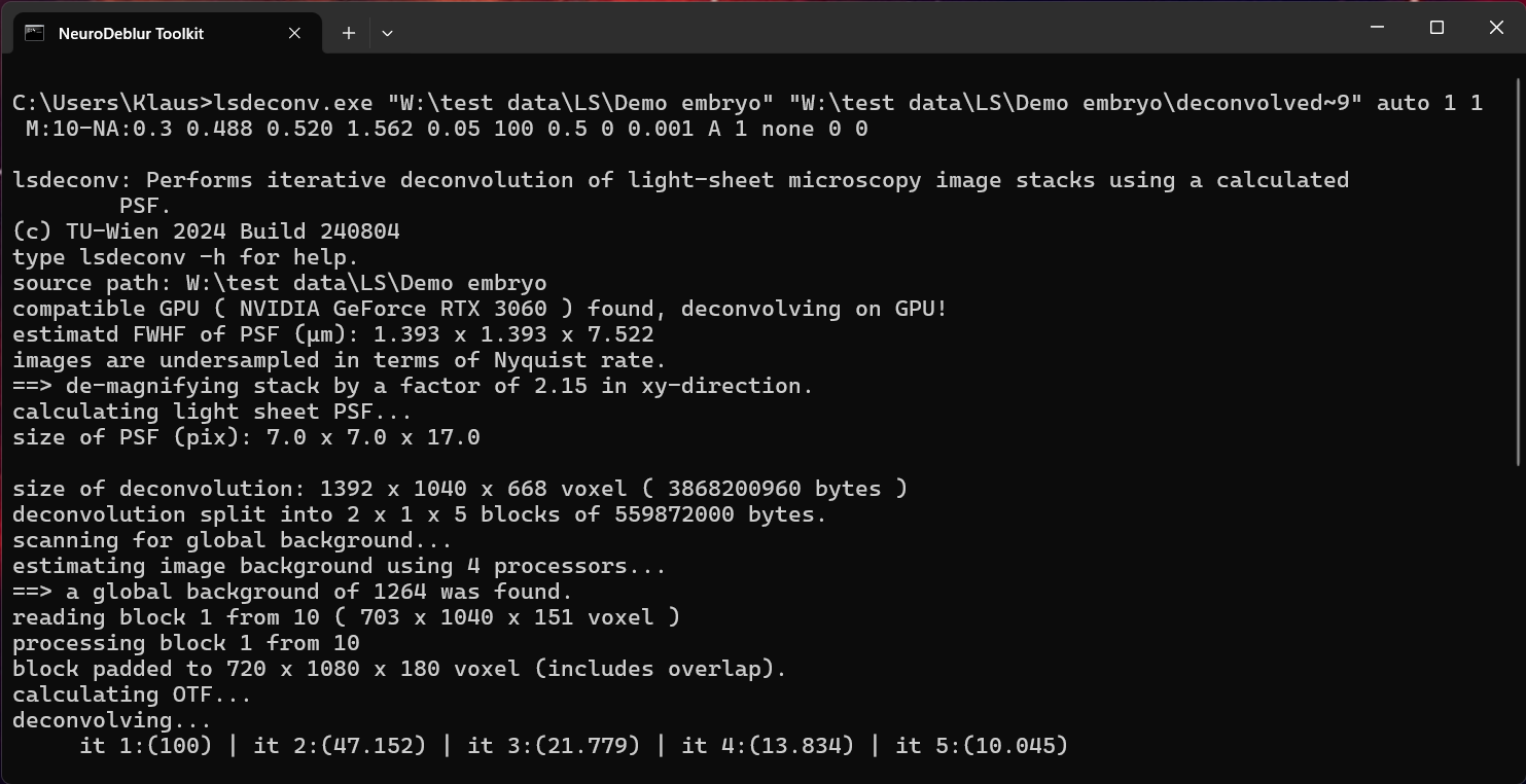 lsdeconv sourcefolder * auto 1 1 M:10-NA:0.3 0.488 0.520 1.562 0.05 100 0.5 0 0.01 B:75 1 none 0 0 where sourcefolder is the location of the folder containing the demo TIFF images (e.g., "c:\users\me\desktop\my-testdata"). Enclose the entire file path in quotes if it contains spaces. The deconvolution process progress is printed to the console window (figure 5.8).