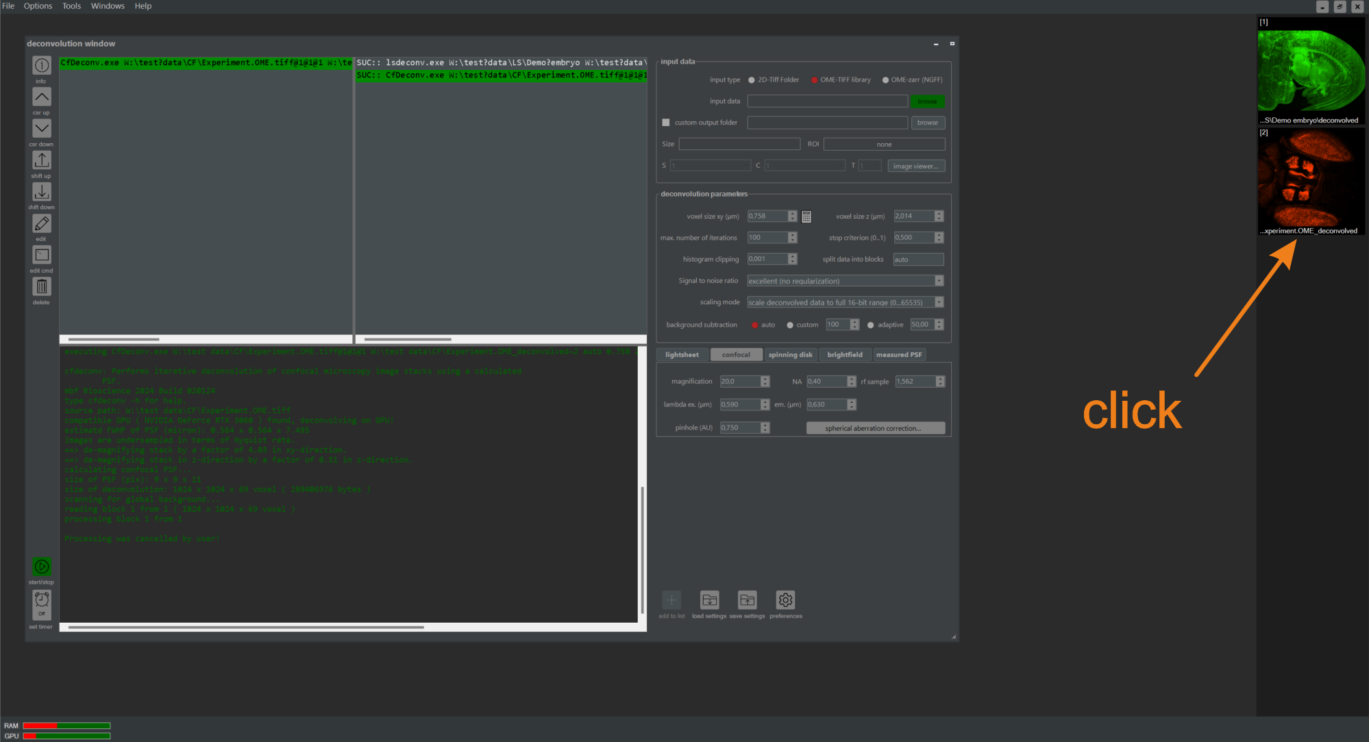 Figure 5.5 Deconvolving the demo embryo using the graphical user interface (NovoDeblurGUI). For each completed deconvolution task, a preview icon is displayed in the preview area. Double-clicking it opens a detailed view of the results.