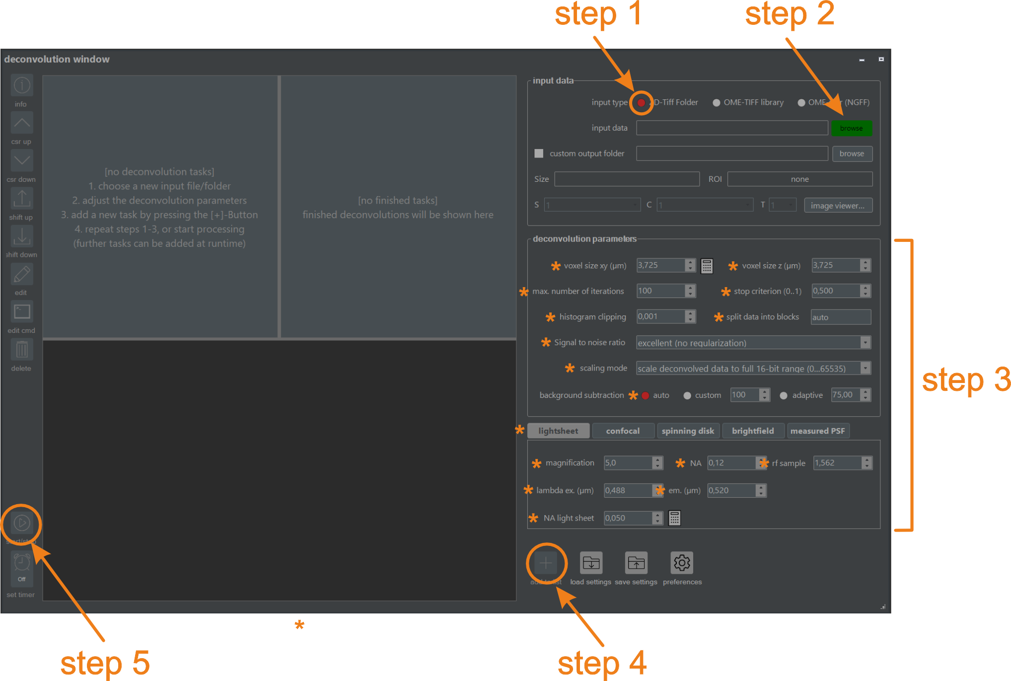 Specify the deconvolution parameters, such as the numerical aperture (NA) of the objective, the refractive index of the embedding medium, and the voxel size. Select the tab labeled "use light sheet" and enter the parameter values exactly as indicated in figure 5.1 (Step 3). Press the TAB key to move to the next input field after entering each value.