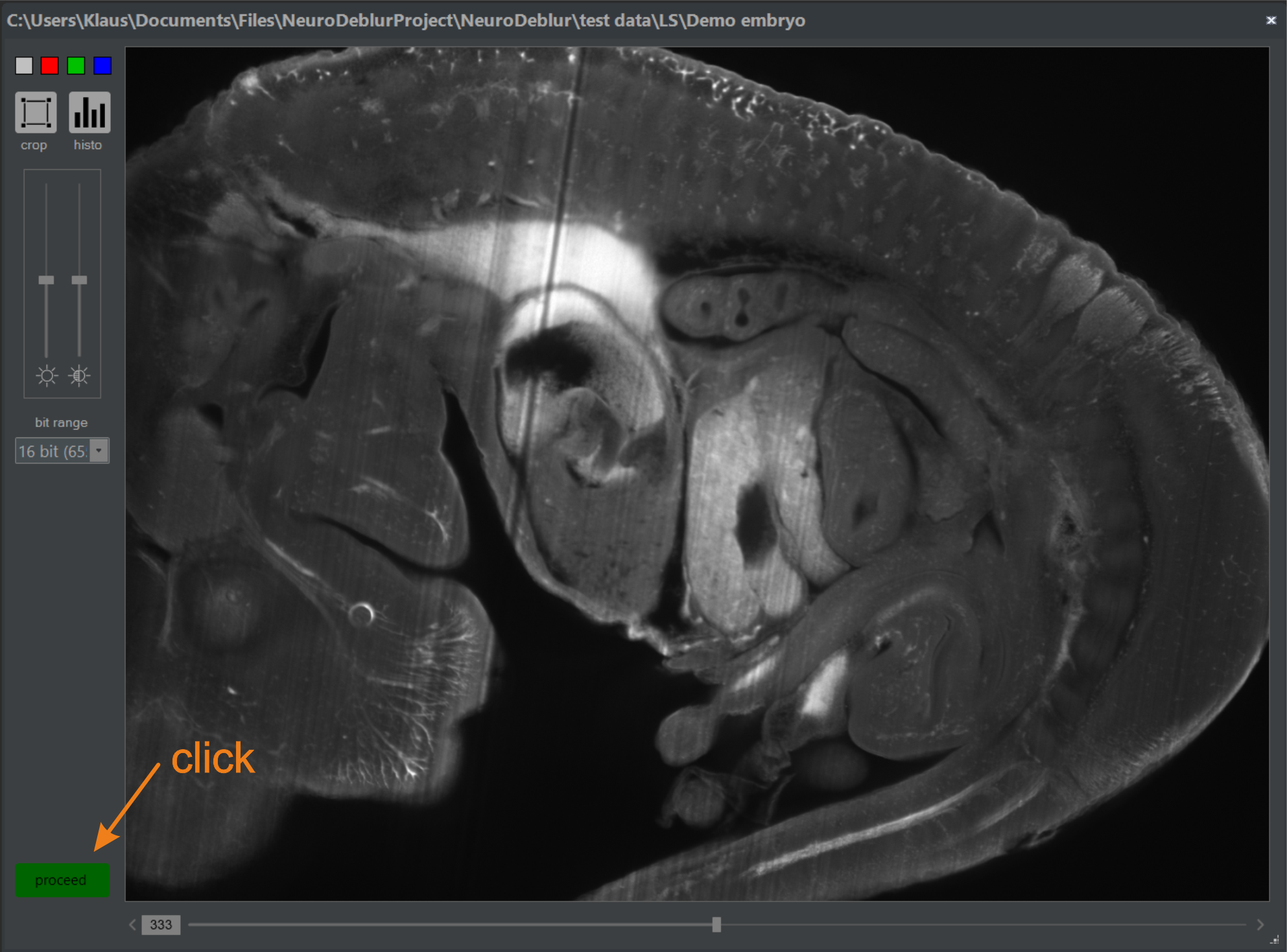 If "from library" is selected, a standard file selector box opens after clicking the button indicated in figure 5.1 (Step 2). Otherwise, a folder selection box opens for specifying the directory containing the TIFF images. After selecting the input file or folder, the image inspector opens automatically if activated in the Preferences Menu. If the image inspector opens, it can be closed immediately by clicking the proceed button (figure 5.2), or used to specify a region of interest. For more options provided by the image inspector, refer to Chapter 2.4.3.