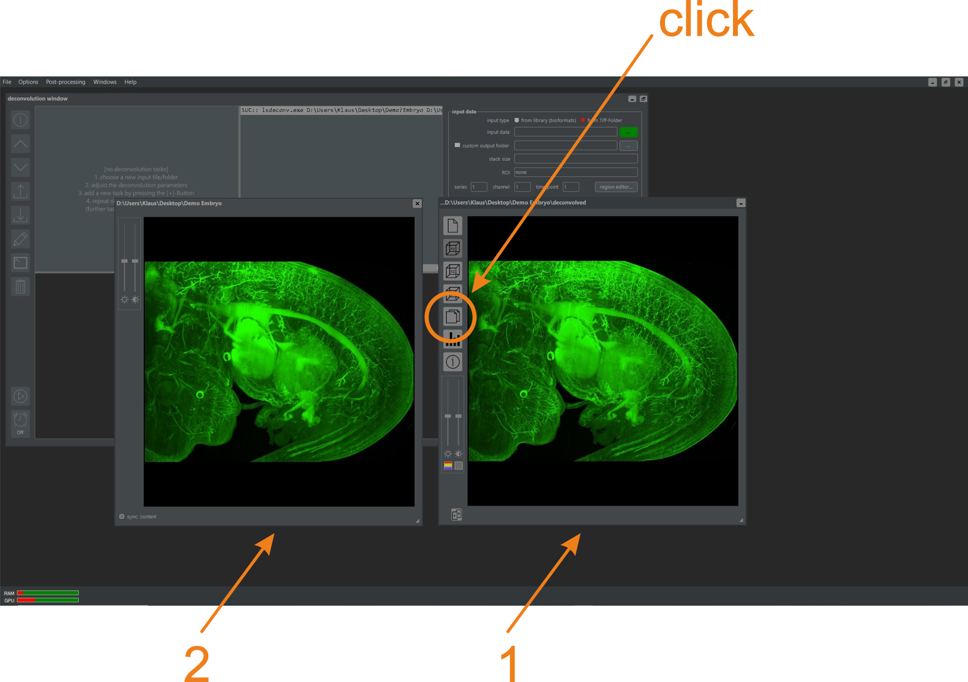 After the deconvolution is complete, a preview icon is added to the preview area of the main program window (figure 5.5). Double-clicking it opens a result window providing an enlarged view of the deconvolved data set (figure 5.6). Buttons on the left side of the window offer options such as changing the view direction or switching between slice-by-slice and MIP projections from three basic viewing directions. For more details about the result window, refer to Chapter 2.4.4 of this manual. Clicking the encircled button in (figure 5.6) opens a second window showing the raw data for comparison. Zooming or panning in the result window simultaneously alters the content of the raw data window unless this functionality is disabled.